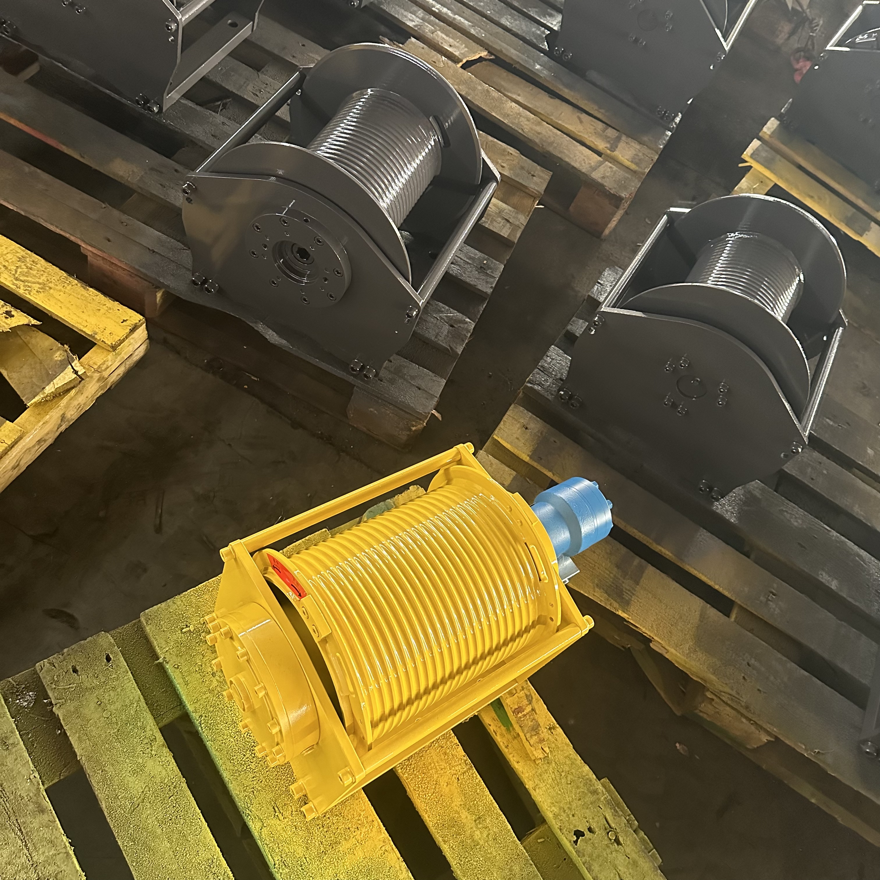液壓絞車以液壓油為工作介質(zhì),通過液壓馬達(dá)將液壓能轉(zhuǎn)化為機(jī)械能,驅(qū)動卷筒旋轉(zhuǎn),實現(xiàn)鋼絲繩或鏈條的收放,從而完成物料的升降或牽引作業(yè)。液壓系統(tǒng)中的控制閥可以精確控制液壓油的流量和壓力,進(jìn)而實現(xiàn)對絞車的速度、扭矩和方向的靈活控制。
